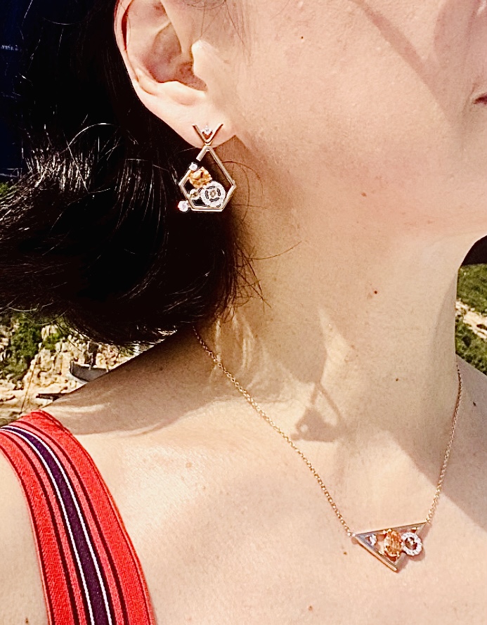 The left corner of the pendant is in 18K white gold, contrasting playfully with the rest of the piece in 18K rose gold.