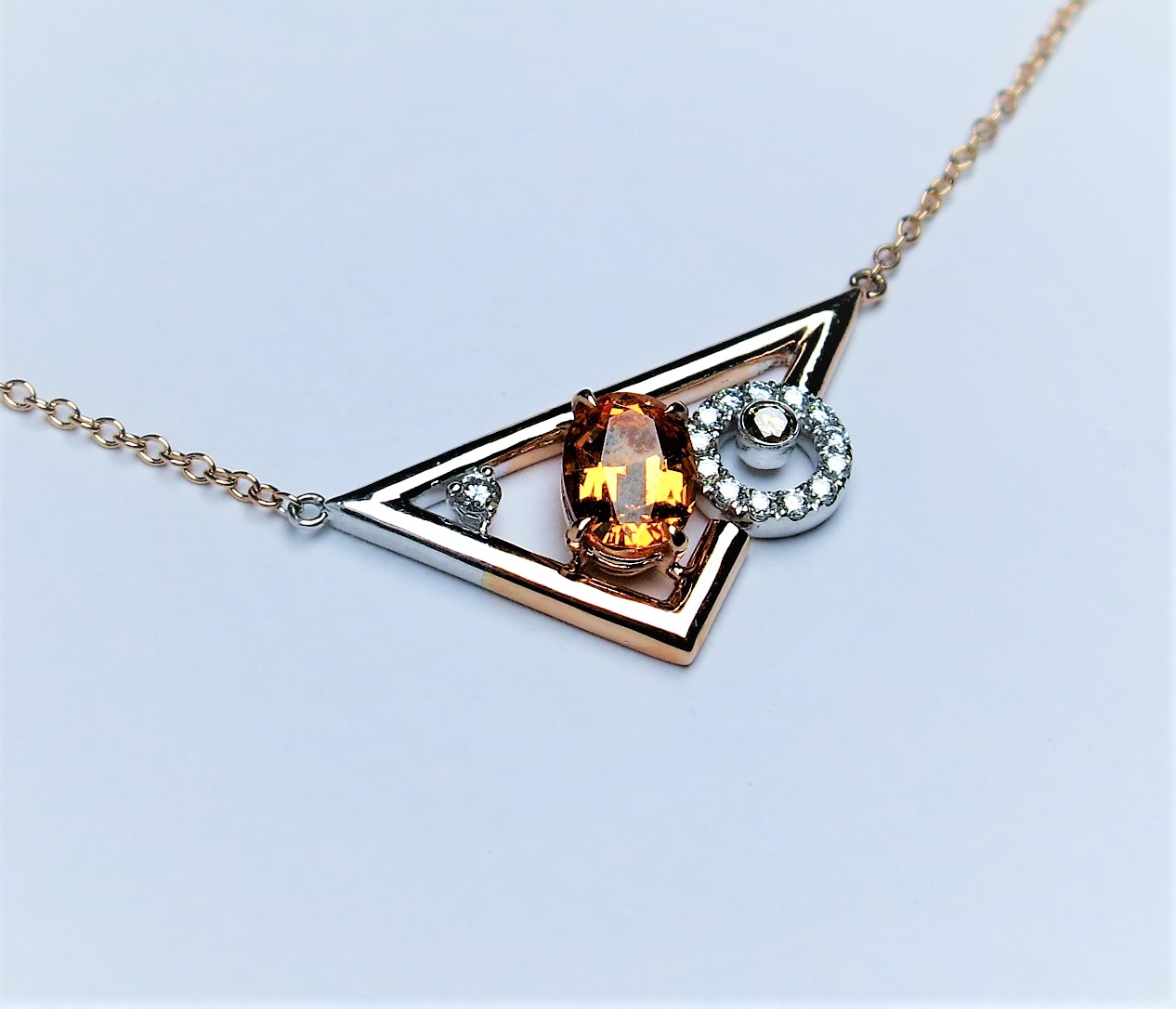 A modern geometric looking mandarin garnet and diamond pendant with rose gold chain.