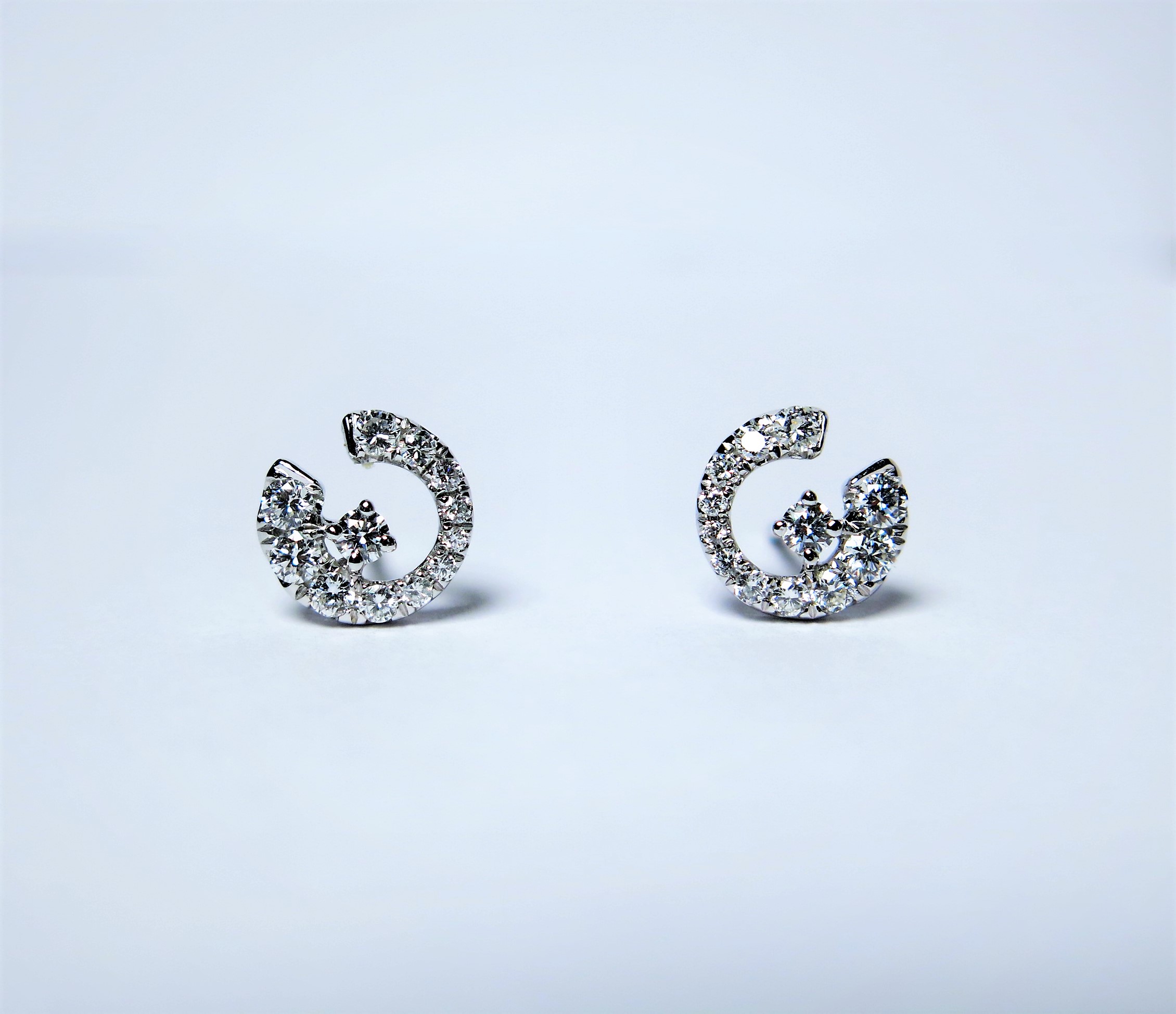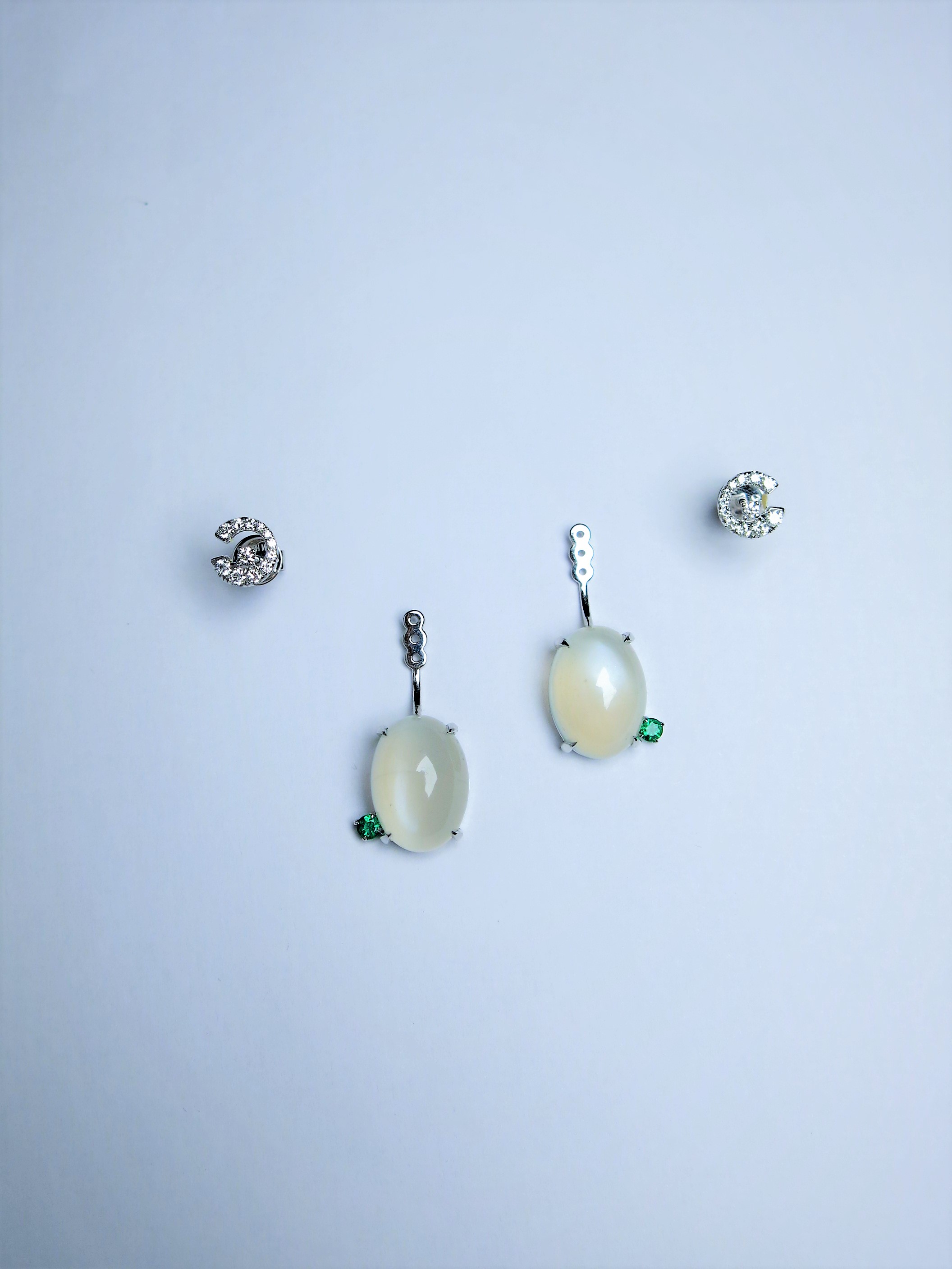 A beautiful geometric mix of circles and oval shapes in different dimensions, together with a fun visual gap between the top diamond studs and the bottom moonstone/ emerald drop.