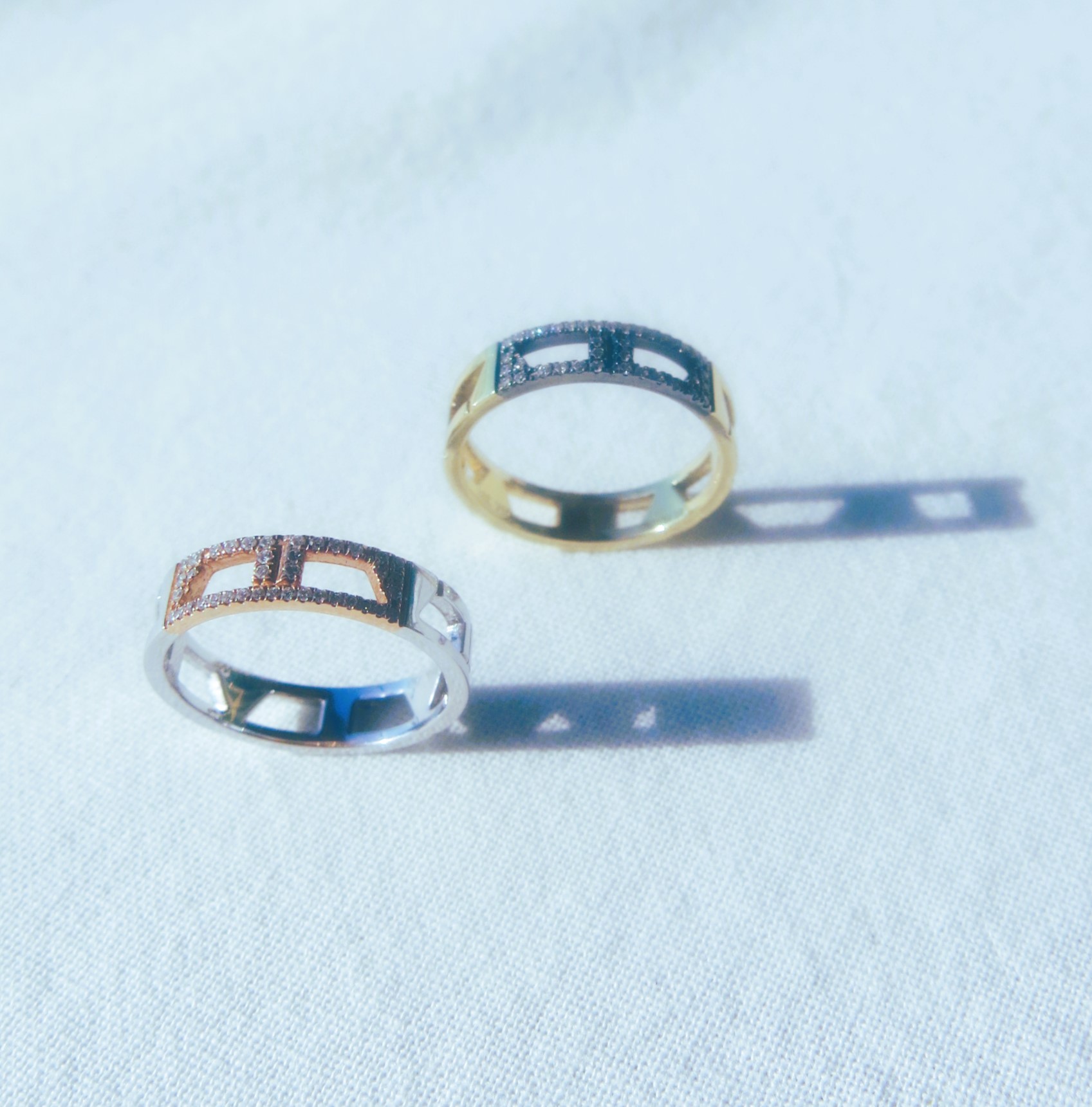 I have put my obsession for lines and shapes and in particular, trapezoids, into these stacking rings, combined with mixed gold colours and diamonds. Endless combinations and chic looks.